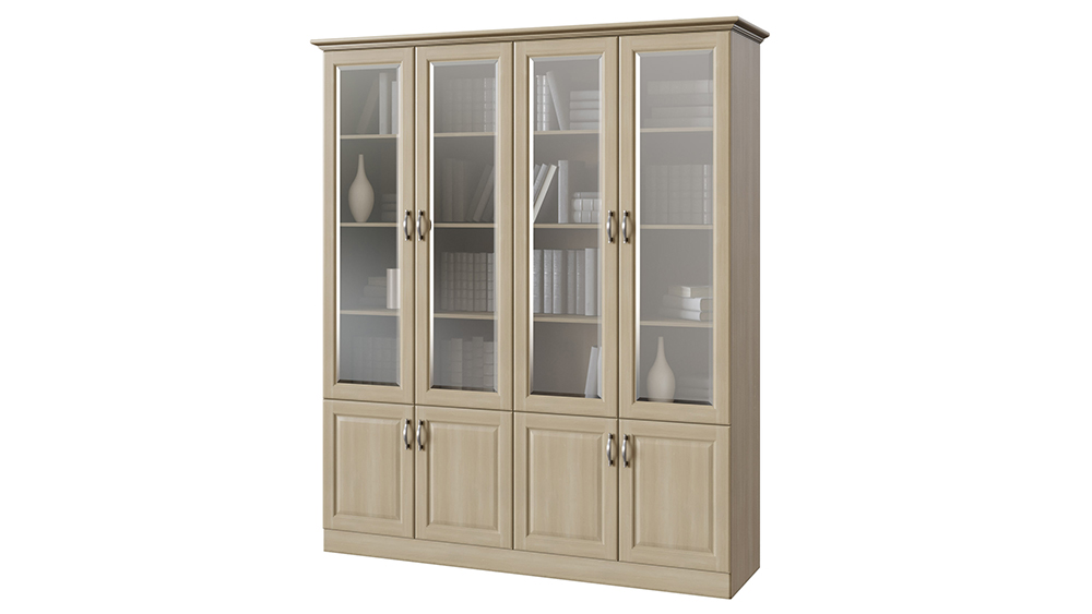 Четырёхстворчатый шкаф библиотека Эдем выполнен в актуальном классическом стиле. Подойдёт для людей, которые ценят порядок и чистоту. Благодаря прозрачному стеклу с фацетом в дверцах шкафа можно будет разглядеть все дорогие вашему сердцу книги и предметы декора, которые вы не хотели бы прятать к закрытый шкаф, но при этом они будут защищены от попадания пыли. Классический стиль шкафа подчеркнёт спокойный и стабильный нрав своего обладателя. А благодаря широкой цветовой палитре вы сможете подобрать шкаф-библиотеку, идеально подходящую под ваш интерьер и настроение. Шкаф может быть изготовлен полностью из натурального массива дерева бука или ясеня. Даже полки шкафа сделаны из целостного массива, что делает вид шкафа более презентабельным и добротным. При желании немного удешевить изделие, мы можем изготовить боковины шкафа из ЛДСП. Обращаем ваше внимание, что такое решение никак не повлияет на визуальный вид товара. Внешние габариты библиотеки: 8 см. к ширине по внешним габаритам карниза. Требуется сборка.