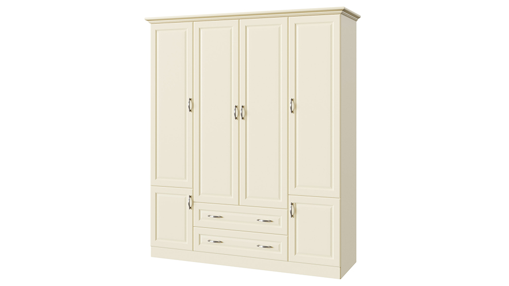 Классический шкаф, созданный в едином стиле с коллекцией Эдем — изделие без которого не возможно себе представить спальню. Корпус шкафа может быть изготовлен как из массива бука и ясеня, так и из массива мягколиственных пород, что делает его стоимость еще более демократичной. Четырех створчатый шкаф имеет 3 базовые комплектации: c антресольной секцией в верхней (4-3) или нижней части (4-1) шкафа или двумя выкатными ящиками (4-2) в нижней части шкафа. В стандартном оснащении двух створчатая секция шкафа располагается по центру шкафа и имеет два выкатных ящика. Фасады шкафа могут иметь встроенные зеркала, как на лицевой части фасада — по размеру филенчатой части, так и на внутренней стороне фасада. Распашные дверцы шкафа оснащены петлями с системой до-закрытия в базовой комплектации. В широкой центральной секции шкафа предусмотрена штанга для плечиков, а в малых секциях предусмотрены полки для хранения вещей. По желанию шкаф может быть оснащен любым количеством полок.