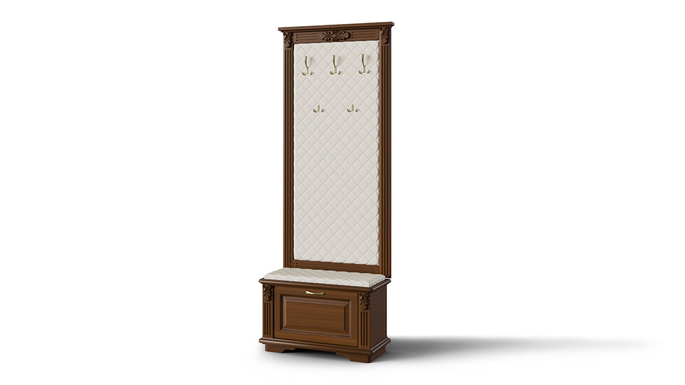 Прихожая Палермо от Dreamline - представляет собой панно с креплением к стене и пуф-банкетка в едином классическом стиле Палермо. Изготавливается из массива бука и оббивается мягкой тканью из искусственной замши с ромбообразной прострочкой. Верхняя часть комплектуется пятью (3 побольше и 2 поменьше) вешалками для верхней одежды. В нижней части - пуф обувница, внутреннее пространство поделено горизонтальной полкой, открытие дверцы сверху вниз. Габариты панно: ширина вверху - 86 см., внизу - 82 см.; высота - 171,5 см.; глубина 8 см. Пуф: ширина - 82 см.; глубина - 40 см.; высота 48 см.