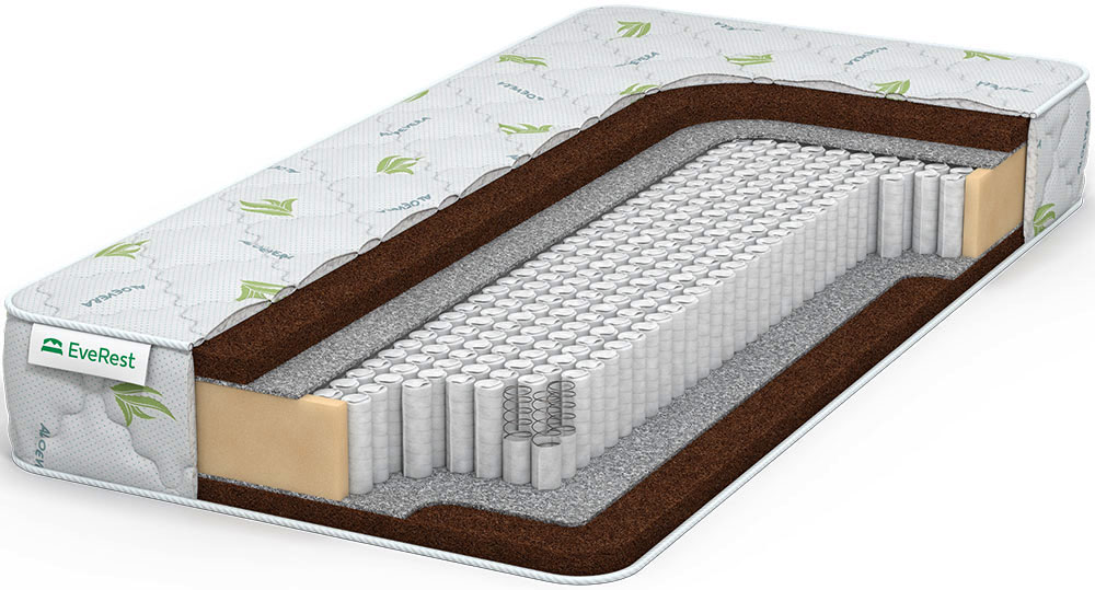 Жесткий пружинный матрас с наполнителем одного вида — койрой кокоса. Относится к моделям с ортопедическим. Блок MultiPocket из адаптивных микропружин (500 пр./кв.м) лежит в основе матраса. Каждая пружина с толщиной сечения проволоки 1,3 мм имеет 8 витков. Они не связаны между собой, поэтому на нагрузку реагируют точечно. Жесткость и ортопедические свойства модели придают кокосовые настилы 3 см толщиной. Это натуральный наполнитель, пропитанный латексом для скрепления волокон кокоса и повышения его пластичности. От пружин койра защищена войлоком. Трикотажный чехол защищен от бактерий составом Aloe Vera.