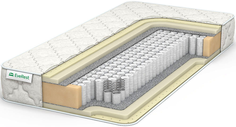 Мягкий пружинный матрас с двумя видами наполнителя — искусственным и природным латексом. Модель с одинаковой жесткостью спальных поверхностей.