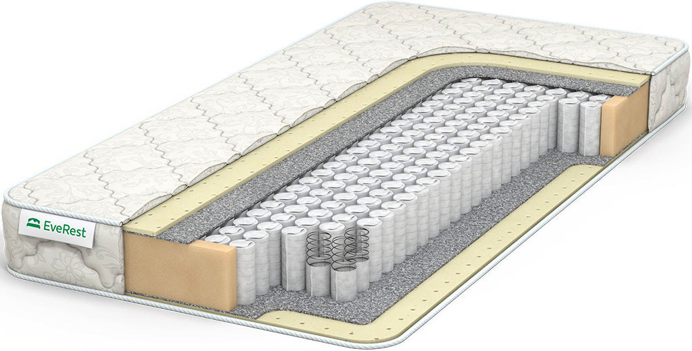 В основе лежит блок из небольших пружин TFK (250 пр./кв.м) с толщиной проволоки 1,8 мм. За счет большого количества пружин матрас точно повторяет изгибы тела.